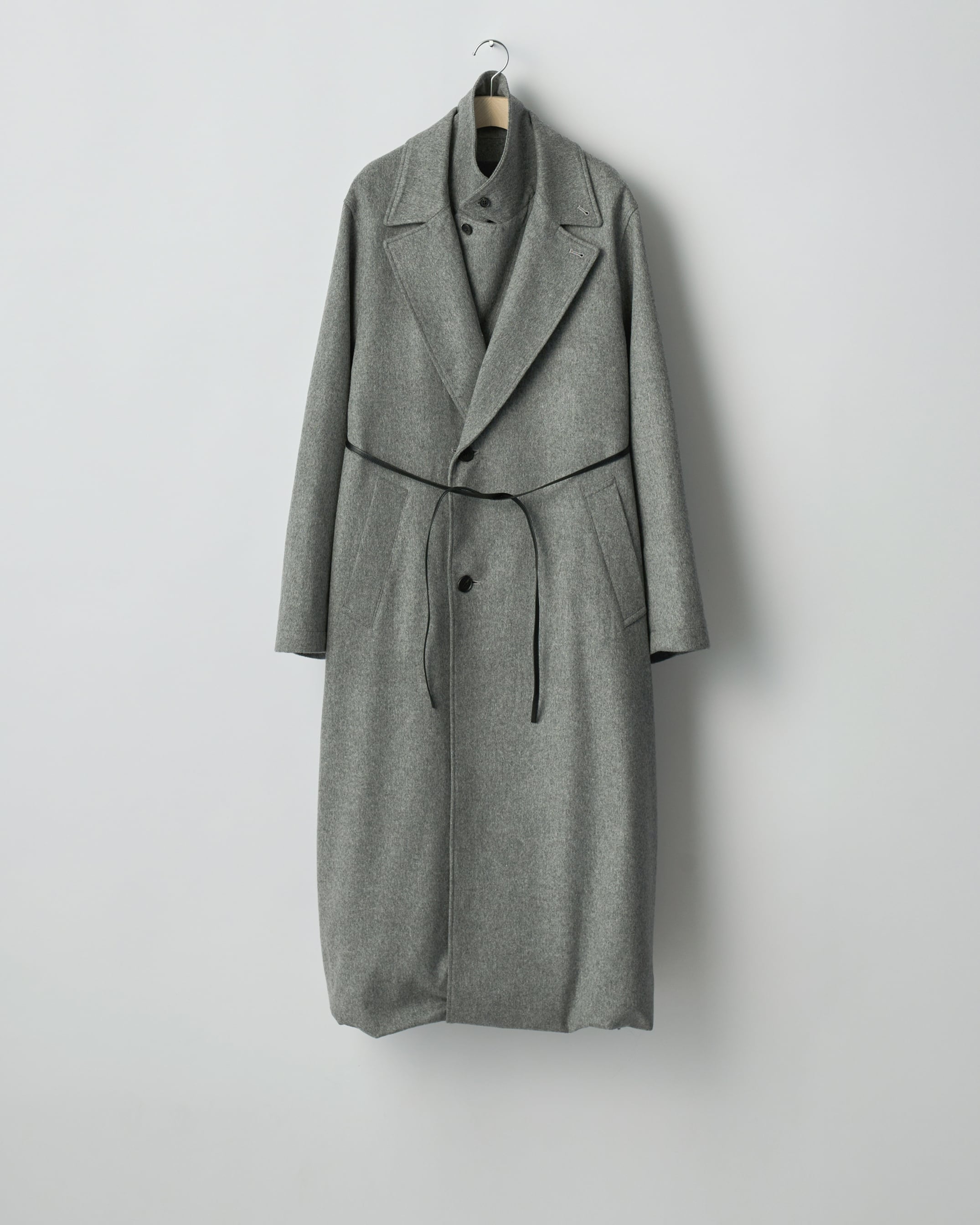 外側のコートの裾から内側のロングベストの裾に繋がるように設定したレイヤードコート。裾部分のシルエット、衿・ラペル部分の重なりの印象が強く残るよう、他のエッセンスを極力削ぎ落としていく方向性で製作。