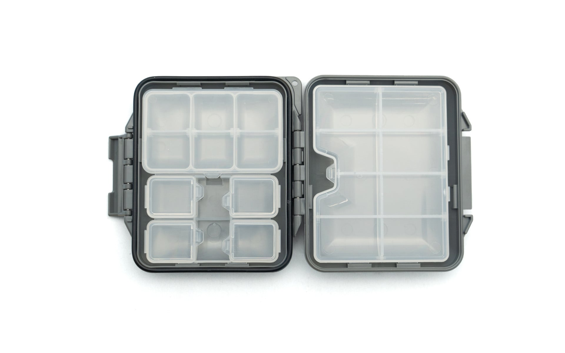 メイホウ社製FB-470/480をベースにカスタム別注。 小型で様々なパーツ収納にぴったりなケースです。インナーケースは3種類付属で用途に合わせて組み換え可能。ケース周囲にはシリコンゴムパッキンを搭載し、防水仕様なので落水時も中身が濡れる事がありません(使用条件によります)。インナー無しで濡れては困るモノを入れるのも可能です。内部の高い気密性により約150g(5.6oz)程度の重さの内容物を収納しても沈まない浮力を備えています。