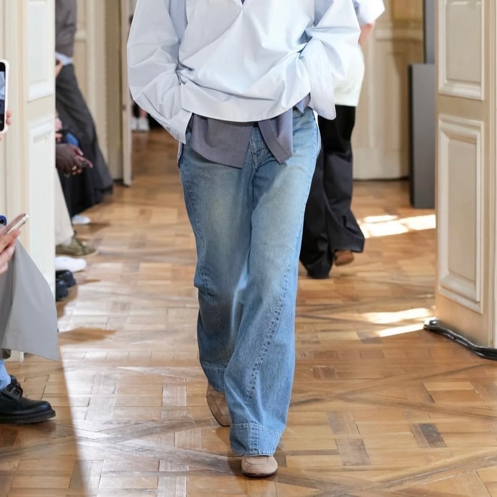 膝周りのツイストがかったシルエット、裾部分のたまり方が特徴のツイストカットデニム。両脇、内側はぎ部分をツイスト気味にパターンを設定し、膝周りにニュアンスを出している。裾部分は前後差、左右差をつけ独特のたまり感に設定している。ストーンウォッシュ、ブリーチ、オーバーダイ、吹付け、手作業によるダメージ感等様々な加工過程を施し奥行きのあるデニムの表情を出している。