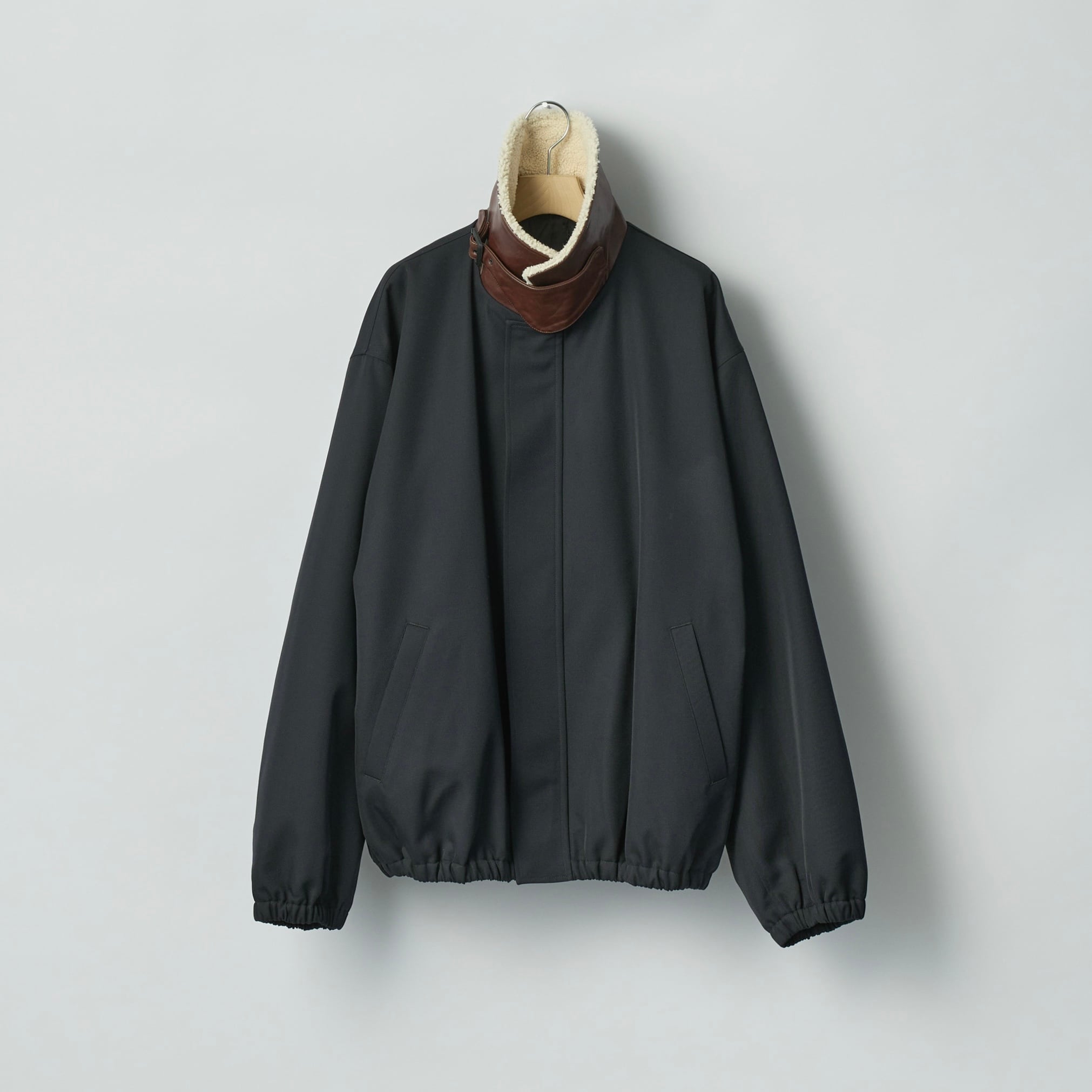 素材感の組み合わせによるコントラストを意識して製作したライト中綿ジャケット。フライトジャケットのディテールをベースに素材を組み合わせながら、全体はミニマルな印象に仕上がるよう製作を進行。表地はしなやかで美しい表情のウールカルゼ、襟にはシープムートン、襟裏・タブにはカウレザーを施している。ジャケットのシルエットが綺麗に出るよう内側は極薄のキルティング仕様に。