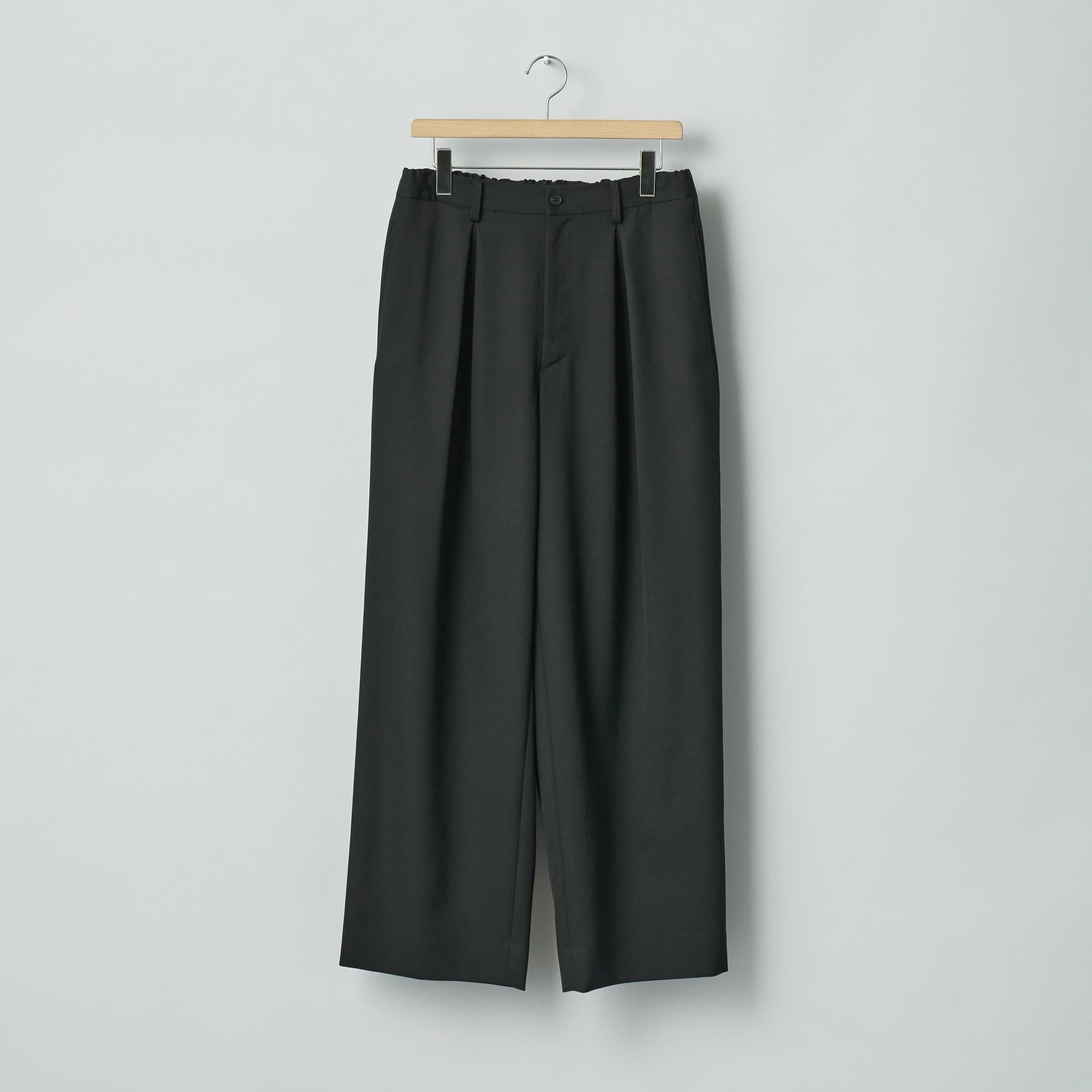 インタック、アウトタック双方のタックをとったイージーワイドトラウザーズ。イージー仕様のため、様々なウエスト位置でジャストで着用可能。ゆったりとしたワイドテーパード気味のシルエットで、様々なトップスと合わせやすいイージートラウザーズ。