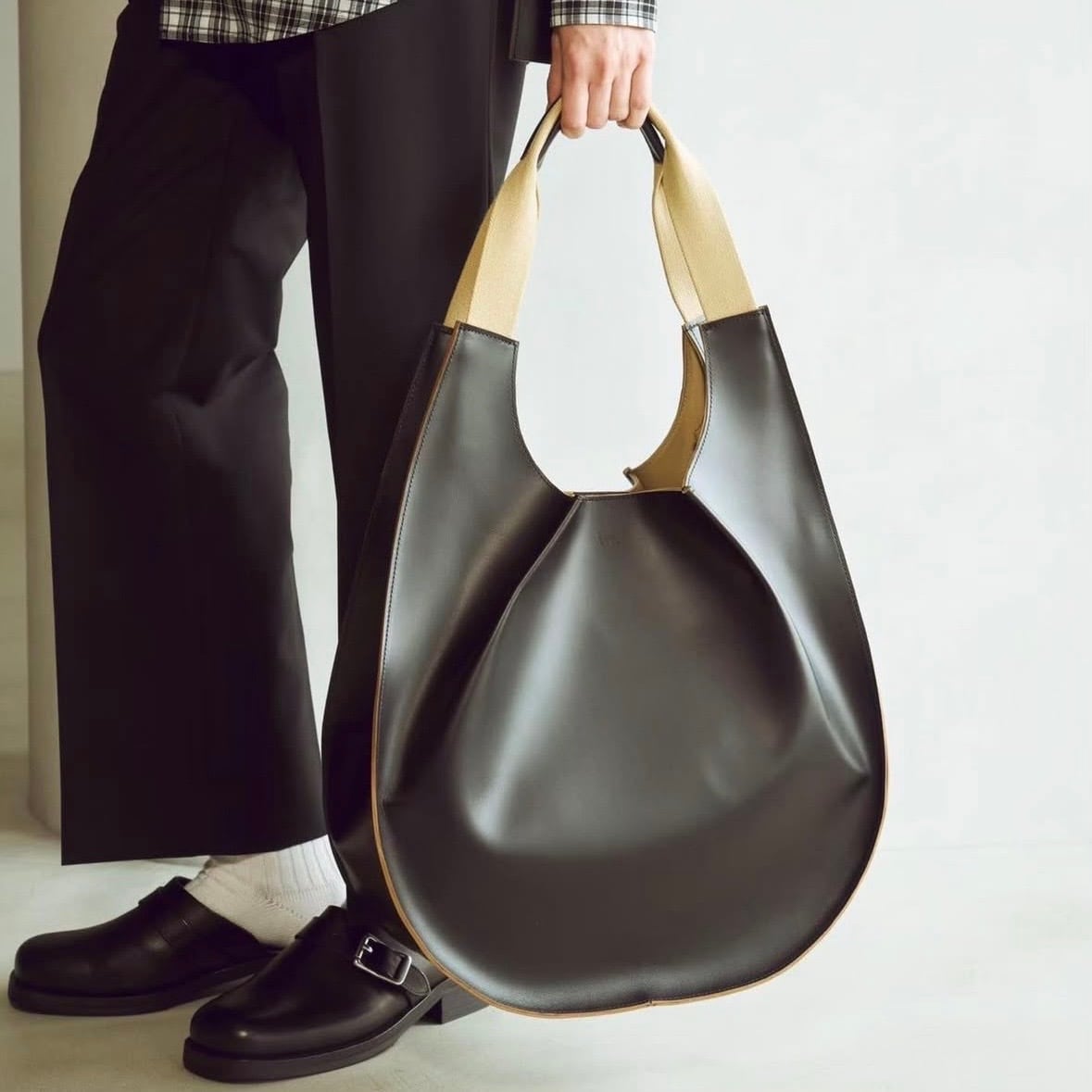 耐久性・耐光性があり、レザーの風合いをよくした合タンレザーを使用。前後口部分にタックデザインを加えることで、丸みがあり独特な立体的なフォルムを演出したデザインがポイント。肩がけ、手持ち2Wayスタイルで楽しめるアイテム。