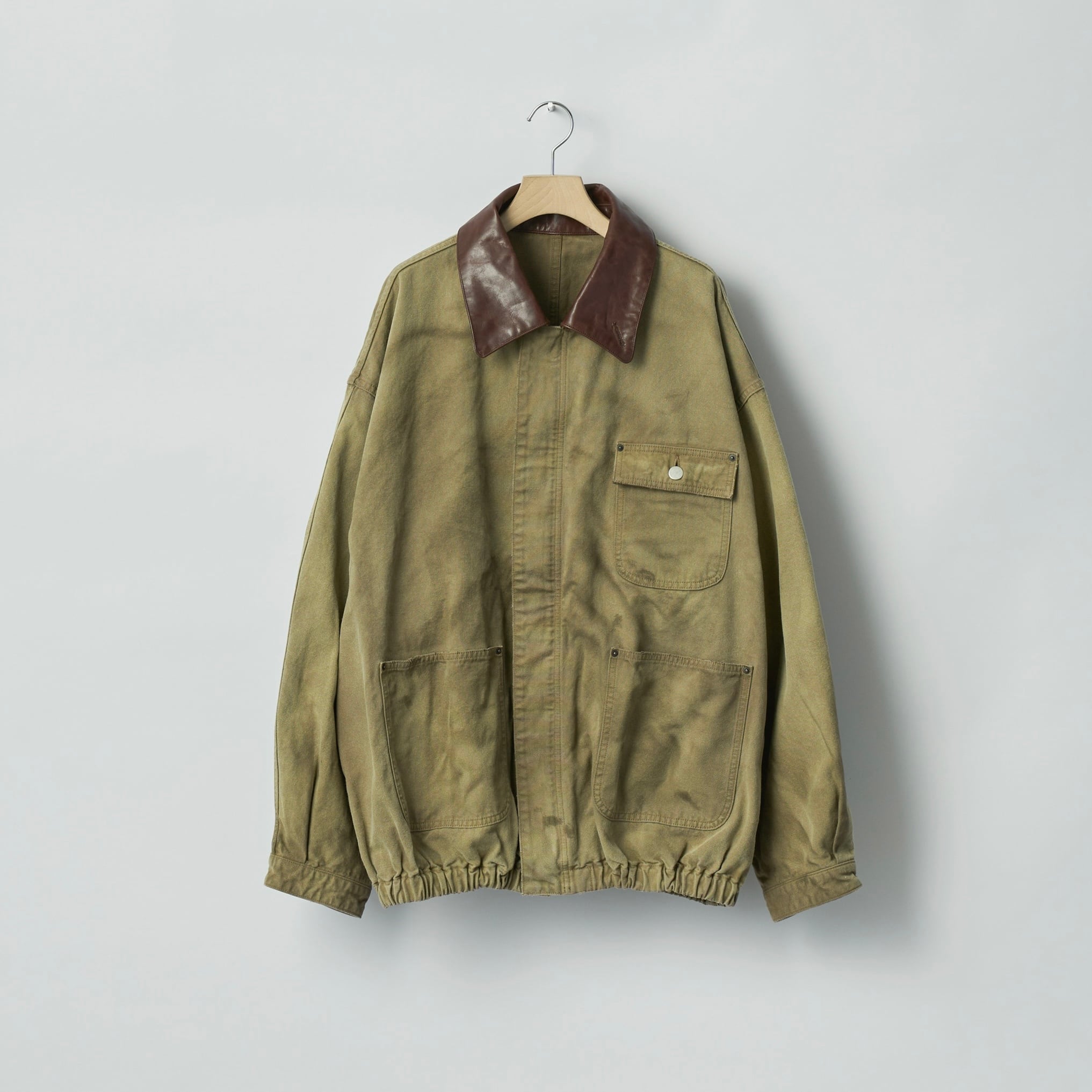 タテ糸に強撚糸を使用した先染め硫化染色のオックスフォード地で製作したジップジャケット。タテヨコで色の濃度差をつけて染めているため、濃く染められたヨコ糸が表面に表れることで、生地染めでは出せない奥行きのある表情になっている。ブリーチ、製品洗い、吹付け、ダメージと加工を重ねていき着古したような独特な表情に。襟のカウレザーも印象的。