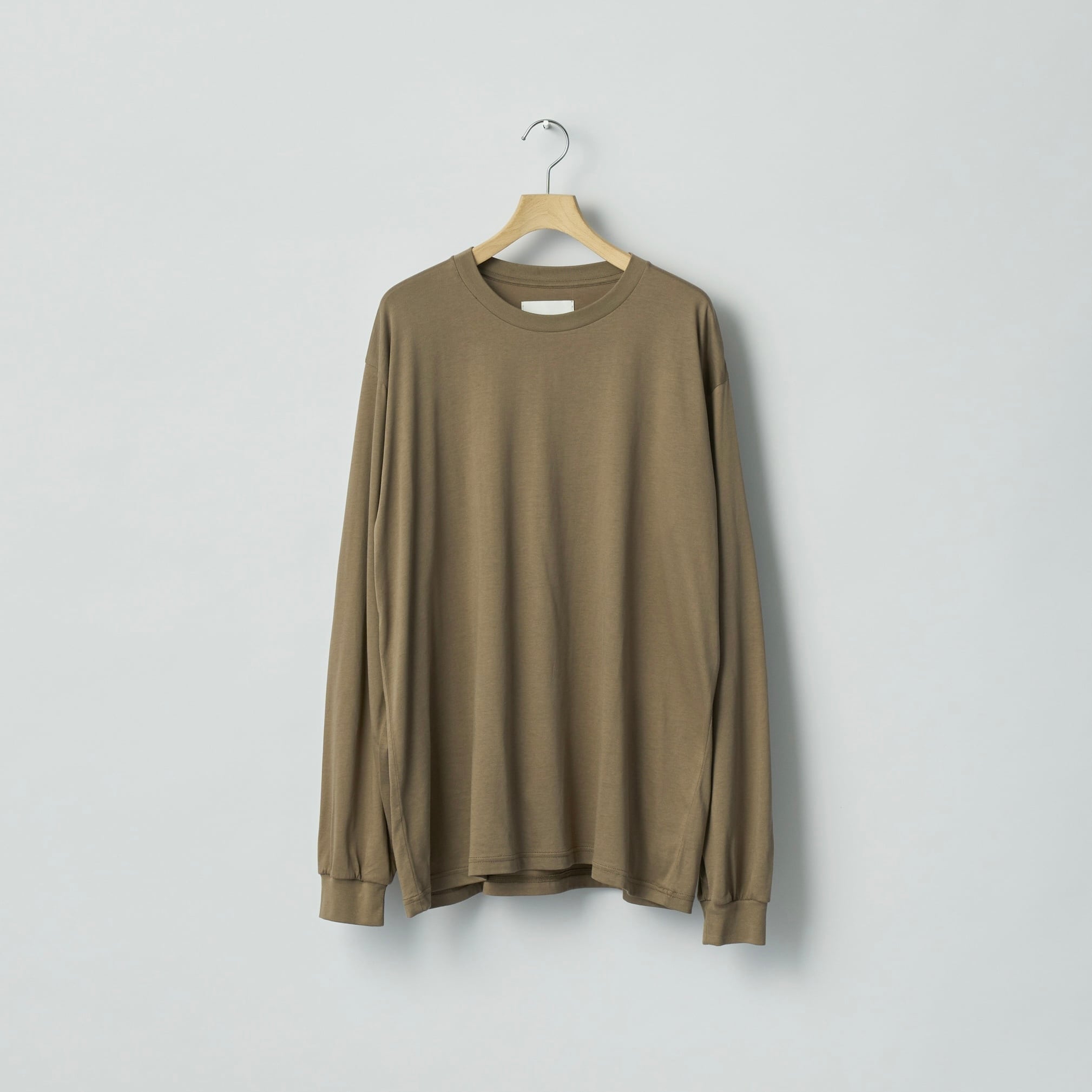 繊維質が非常に細く長い上質なスビンコットンを使用い、35/1で25Gで編まれた天竺。ふわっと柔らかいタッチが魅力で、スビン独特の油分を多く含む滑らかさと柔らかさが特徴。原料の良さからくる非常に柔らかくソフトな着心地が魅力。すっきりとしたサイズ感バランスで製作したLONG SLEEVE TEE。