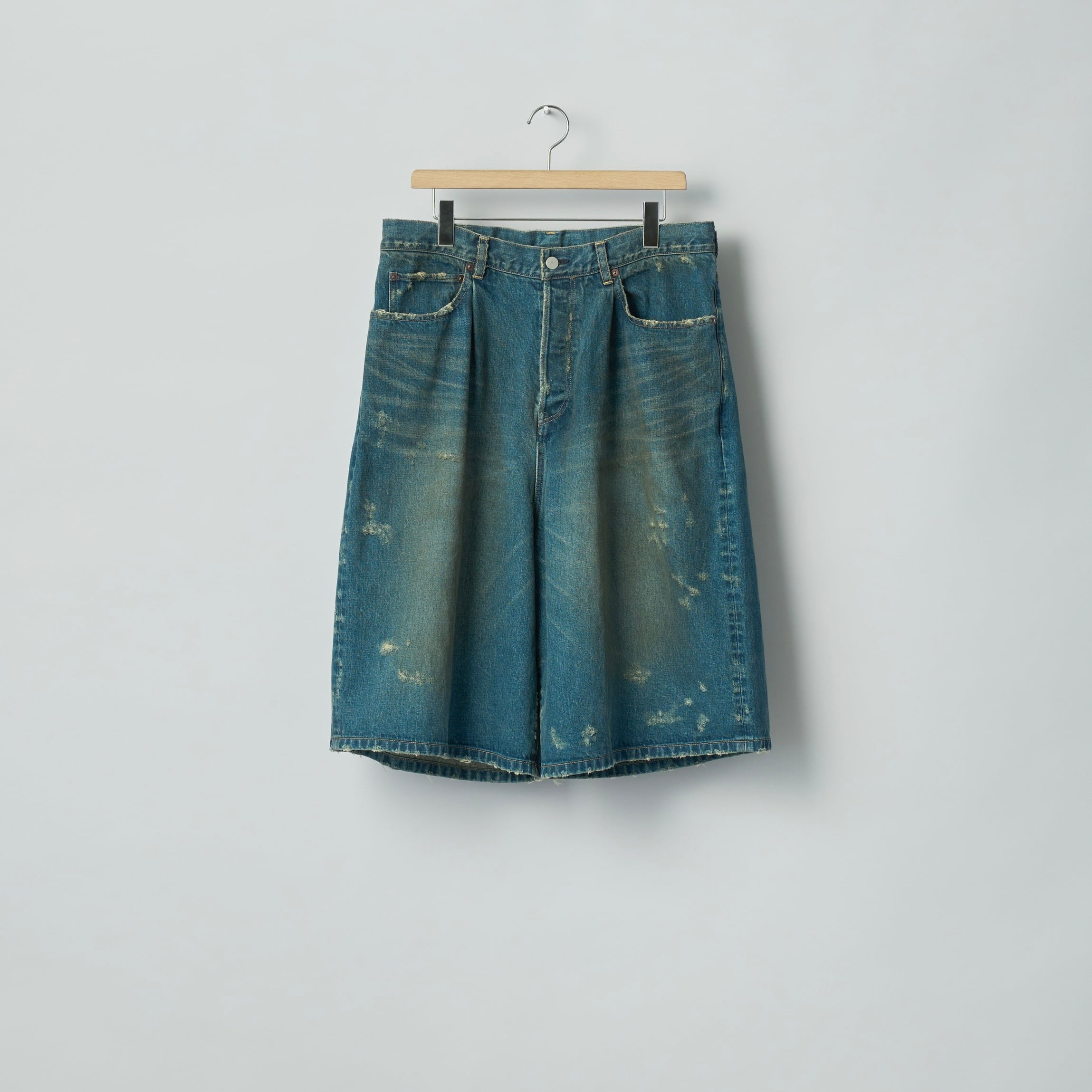 深く設定した股上、長めのレングスのワイドシルエットが特徴のバギーショートデニム。様々な加工を施し、奥行きのあるデニムの表情に仕上げている。ベルトループから縫製箇所まで細かく入るダメージ感も魅力。ウエスト内側はドローコードの仕様。